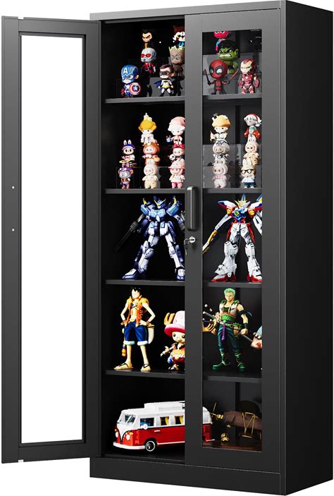 PEUKC Display Cabinet With Glass Doors, 71 Inches Metal Display Case With 4 Adjustable Shelves, Curio Storage Cabinet With Lock For Home, Office, Book