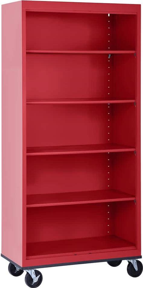 Mobile Bookcase Series 78 in. Tall Red Steel 5-Shelf Standard Bookcase With Casters
