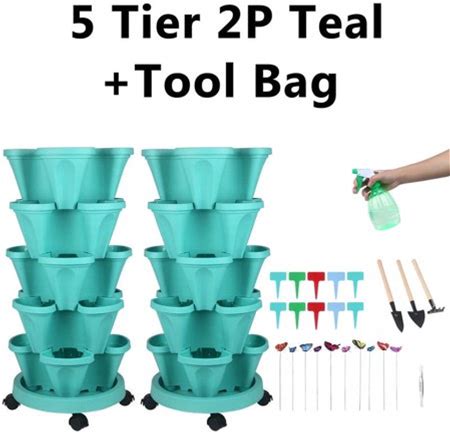 2 Pack Of 5 Tier Stackable Planter Vertical Garden With Various Accessories For Vegetables, Flowers, Herbs, Succulents, Microgreen Gardening - Teal
