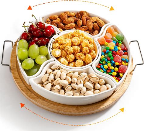 Ceramic Divided Serving Dishes With Bamboo Tray,360° Rotatable Serving Bowls With Handles For Party,5 Removable Relish Tray,11.2 Inch Appetizer