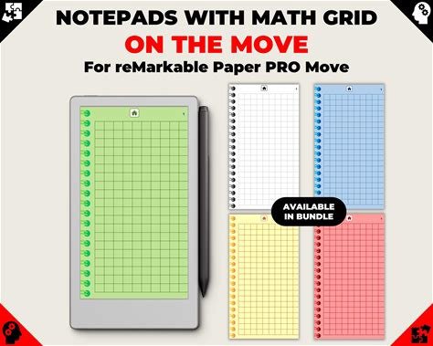 Color Math Grid Notepads/Notebooks For Remarkable Paper Pro Move | 100 Pages | 5 Multicolored Hyperlinked PDF Files