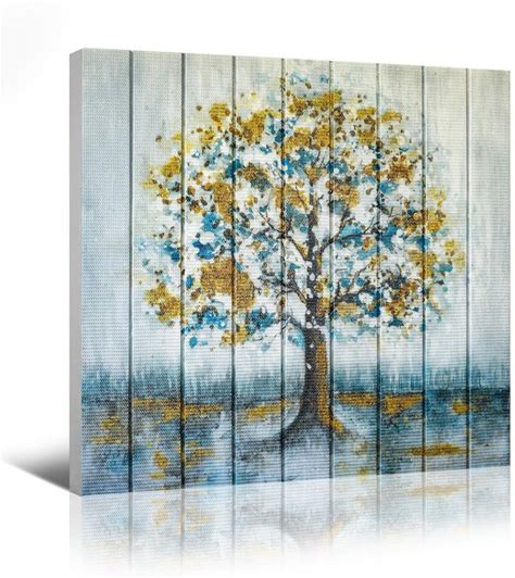 Llribbons Tree Of Life Wall Art Blue Yellow Tree Canvas Prints Abstract Natural Landscape Ribbon Painting Handmade Unique Textured Prints For Living