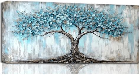 Rahieay Tree Wall Art, Turquoise Nature Tree Of Life Abstract Canvas Painting Textured Painting Pictures Large Landscape Artwork For Living Room