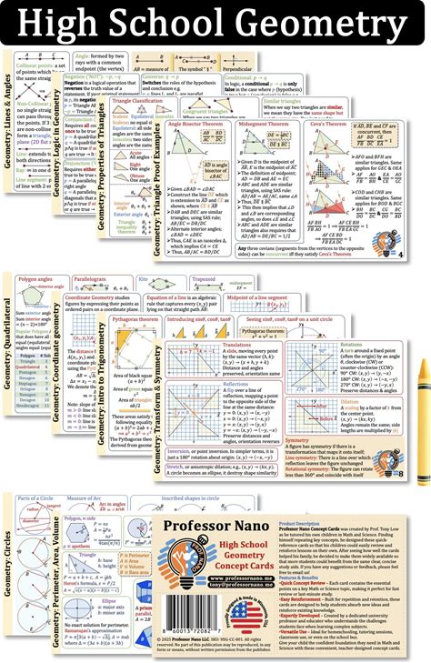 Professor Nano High School Geometry Concept Cards || 4X7.11 Inches, Set Of 11 || Cheat Sheet, Quickstudy