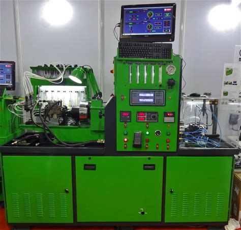 The image shows a diesel fuel injection pump test bench, which i