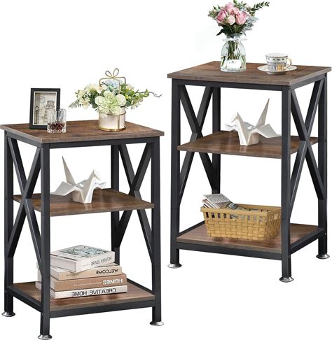 KSWIN Industrial End Table With 2-Tier Storage Shelf, 18'' Square Side Table With X-Design Metal Frame, Rustic Brown Nightstand Bedside For Living